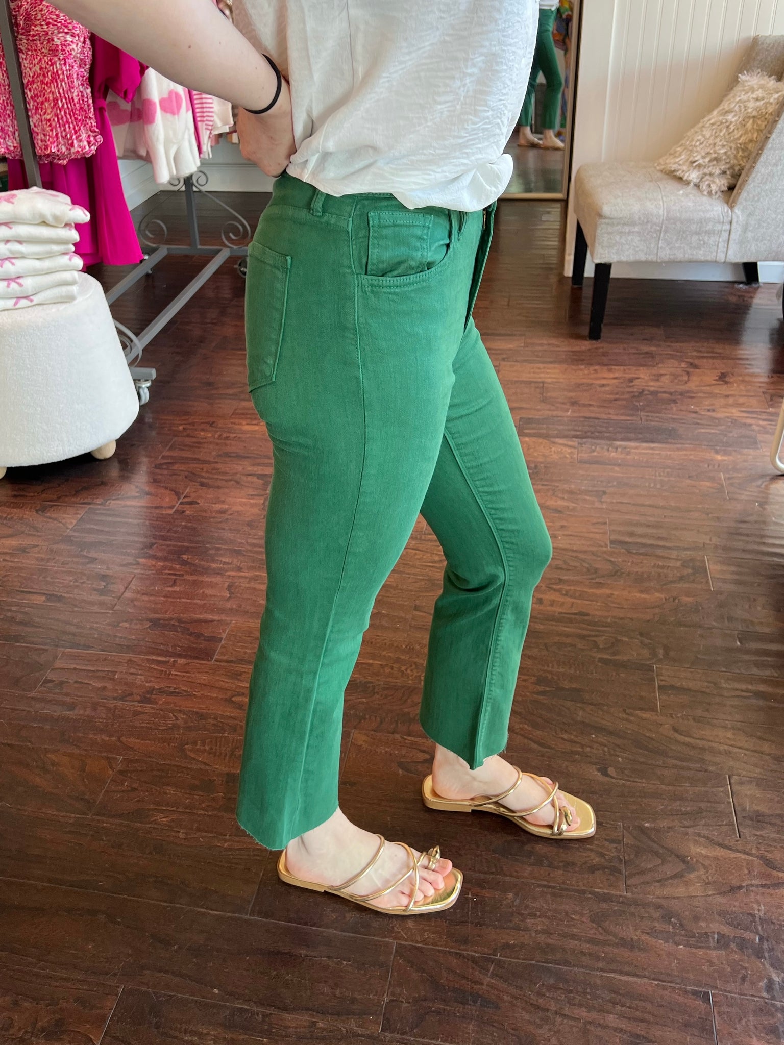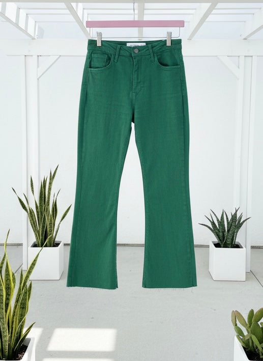Go for a pop of fun with our Day On The Green cropped flare. Featuring a slim fit through the hips and thighs with a gentle kick flare hem that is perfectly cropped at the ankle. The 5-pocket style and light stretch make this a great transitional jean to take you into Spring and Summer.
