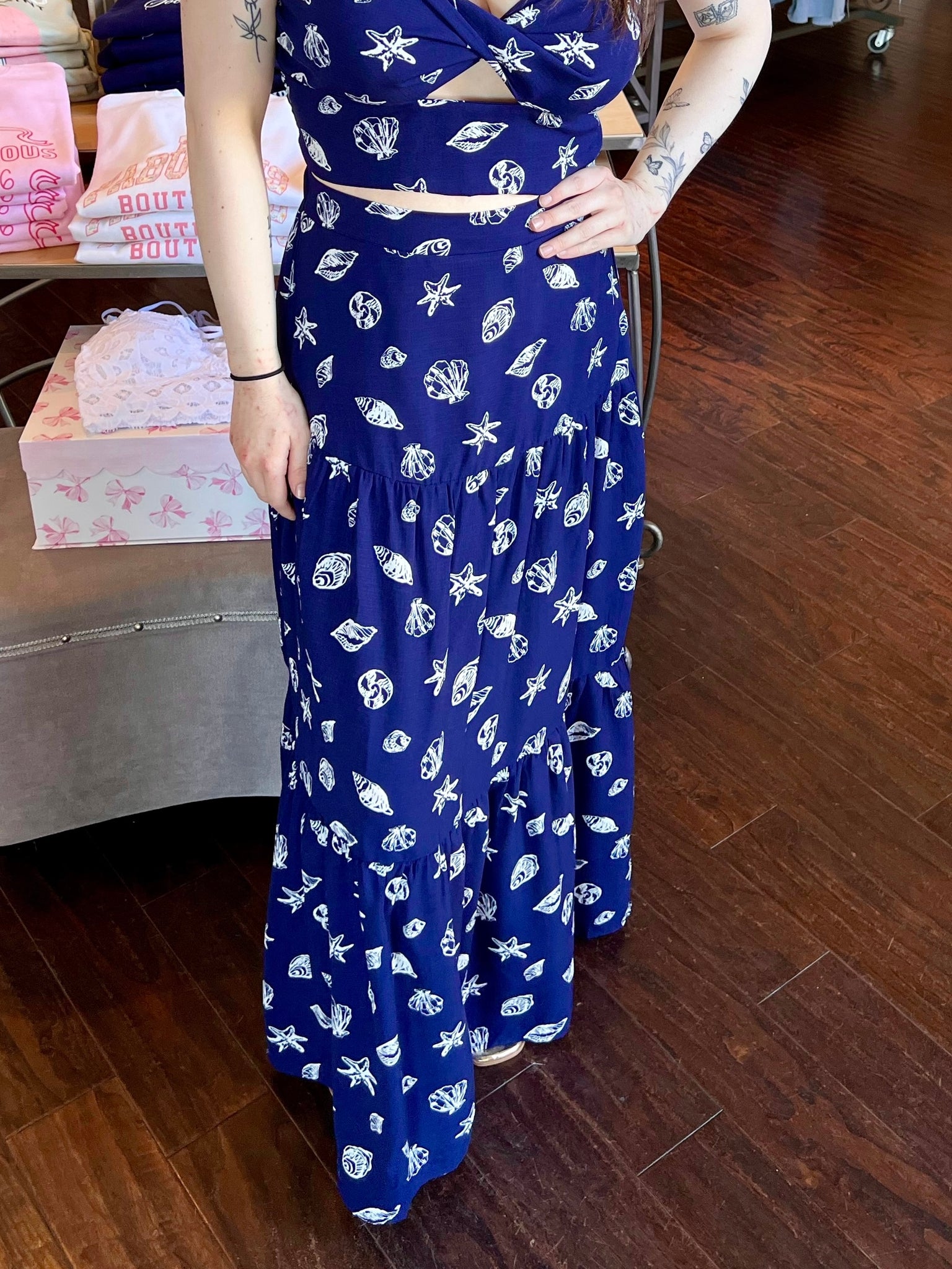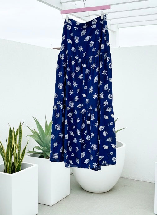 This playful skirt is ready for the shore. It features an elastic waist with tiered sections and a maxi length. The skirt is unlined and pairs perfectly with our Seashell Sensation Cropped Top (sold separately).