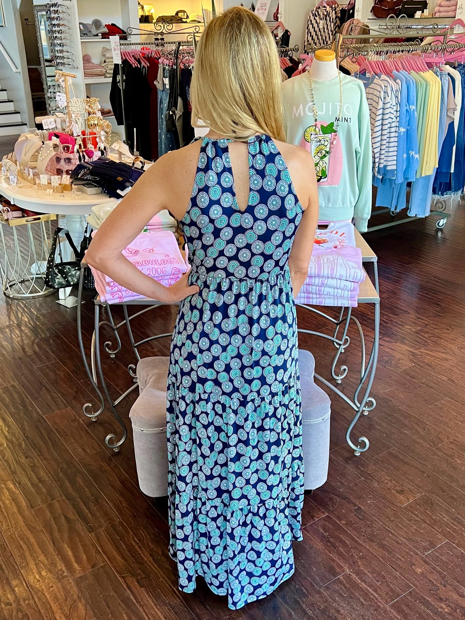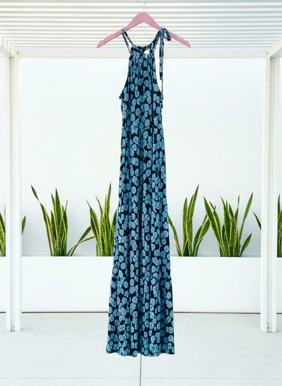 This dreamy dress is packable and ready for any destination on your itinerary. It features a halter style neck with shoulder tie, elastic waist and a tiered maxi length skirt. The fabric is a polyester/spandex blend making it low-maintence.