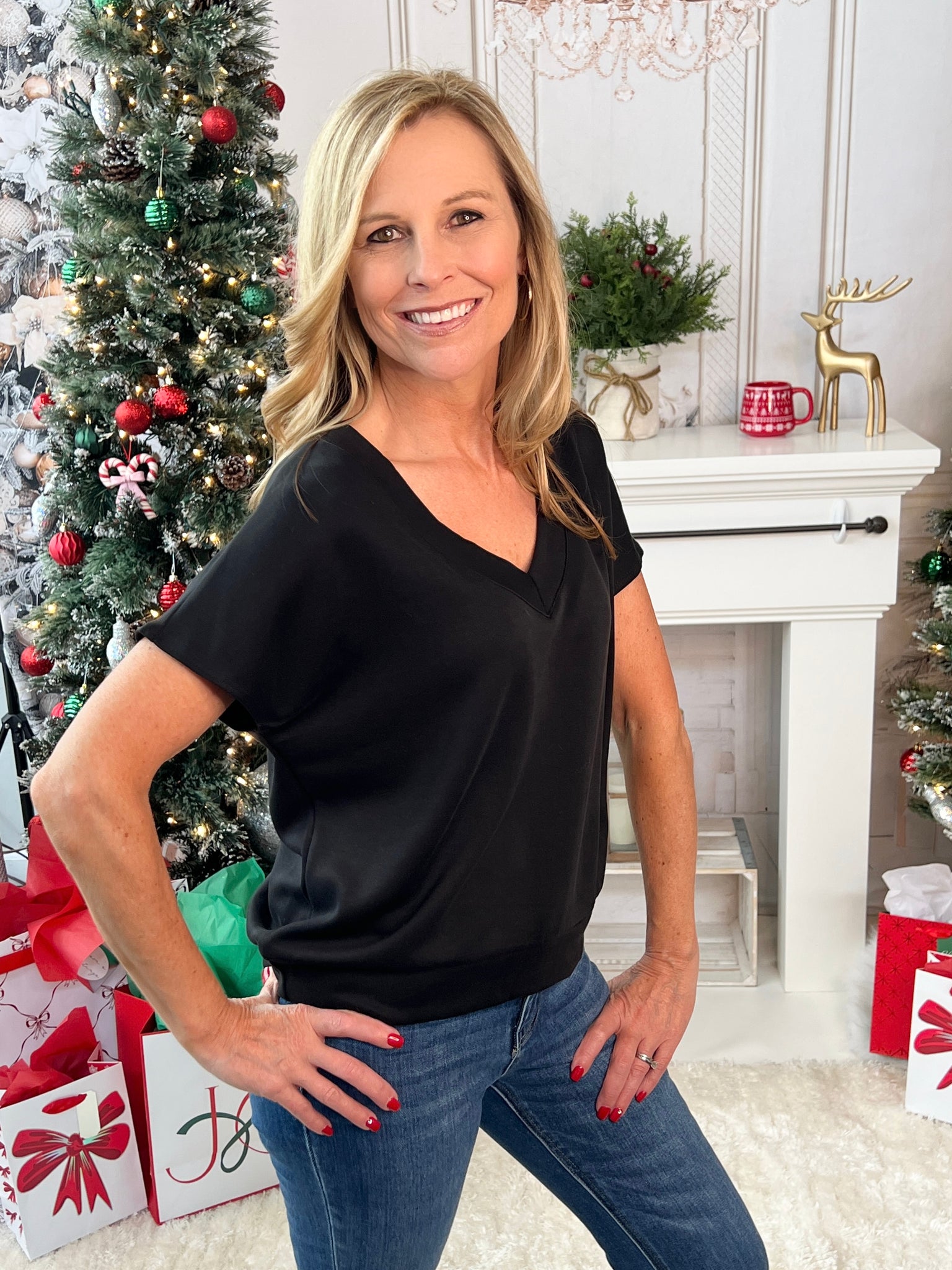 This Techno V-Neck Top in black is a sleek and versatile piece designed to elevate your everyday style. With its flattering V-neckline and smooth, tech-inspired fabric, it offers both comfort and a modern edge. Perfect for dressing up or down, this top effortlessly blends simplicity with a touch of sophistication. A must-have staple for any wardrobe!