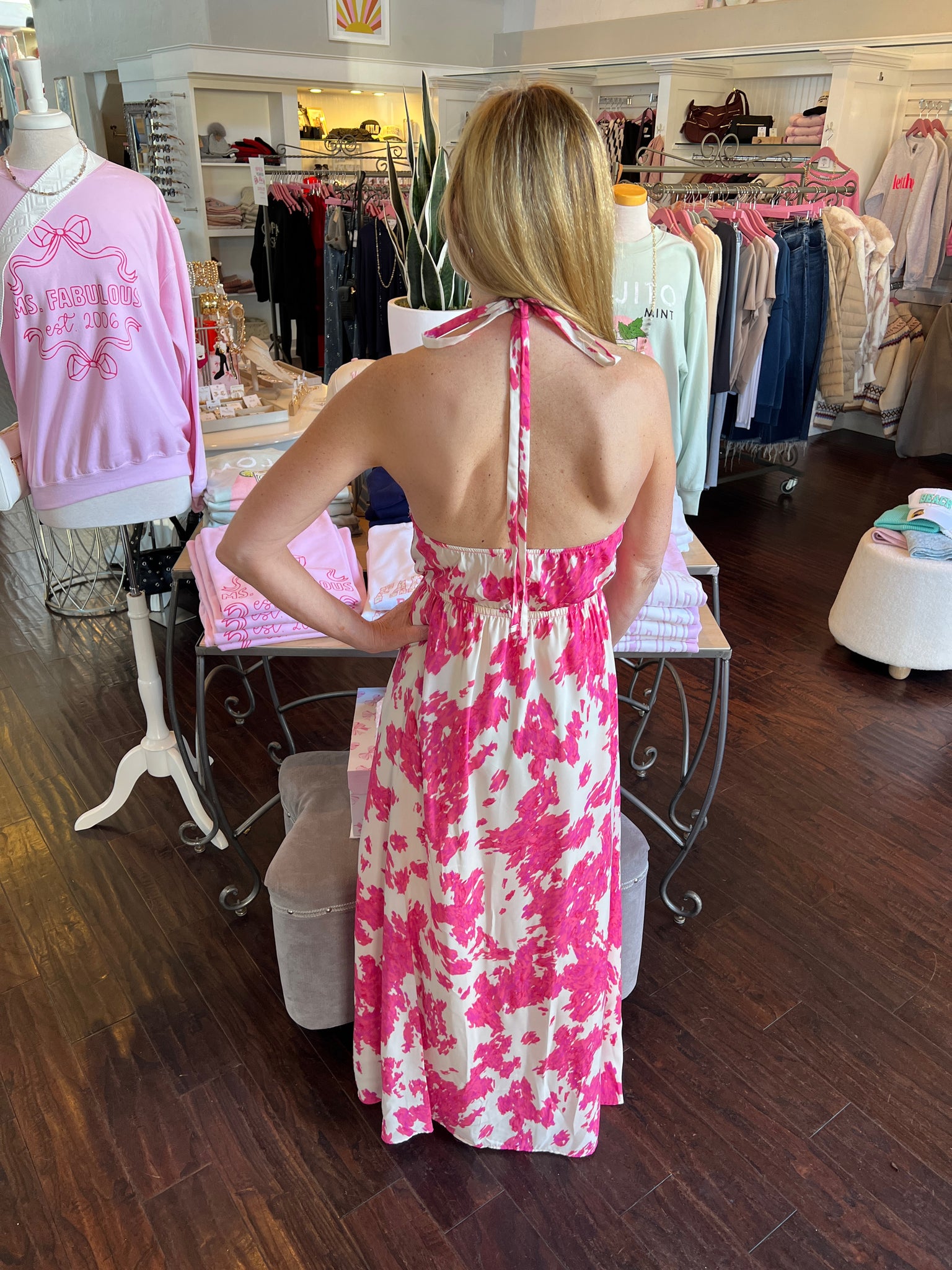 Embrace effortless style with this halter dress, featuring an abstract pink floral pattern. The design includes a flattering tie at the waist, v-neckline and a flowing skirt. Perfect for both daytime and evening events!