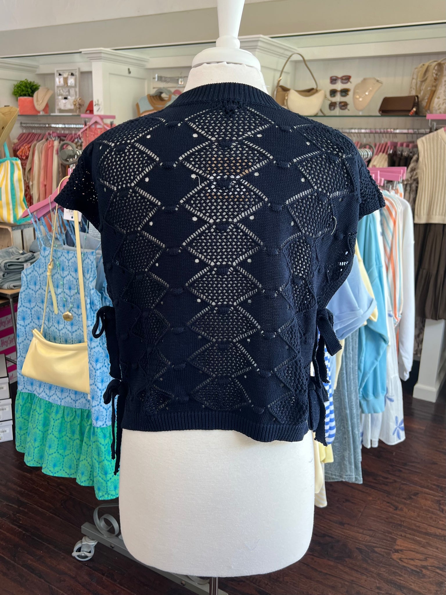 This sweater features a delicate open-knit pattern with subtle clip dot texture throughout. The side tie details add a unique, adjustable fit while keeping the look relaxed and easy. Lightweight and breathable, it’s perfect for layering or wearing on its own. Available in navy and cream.