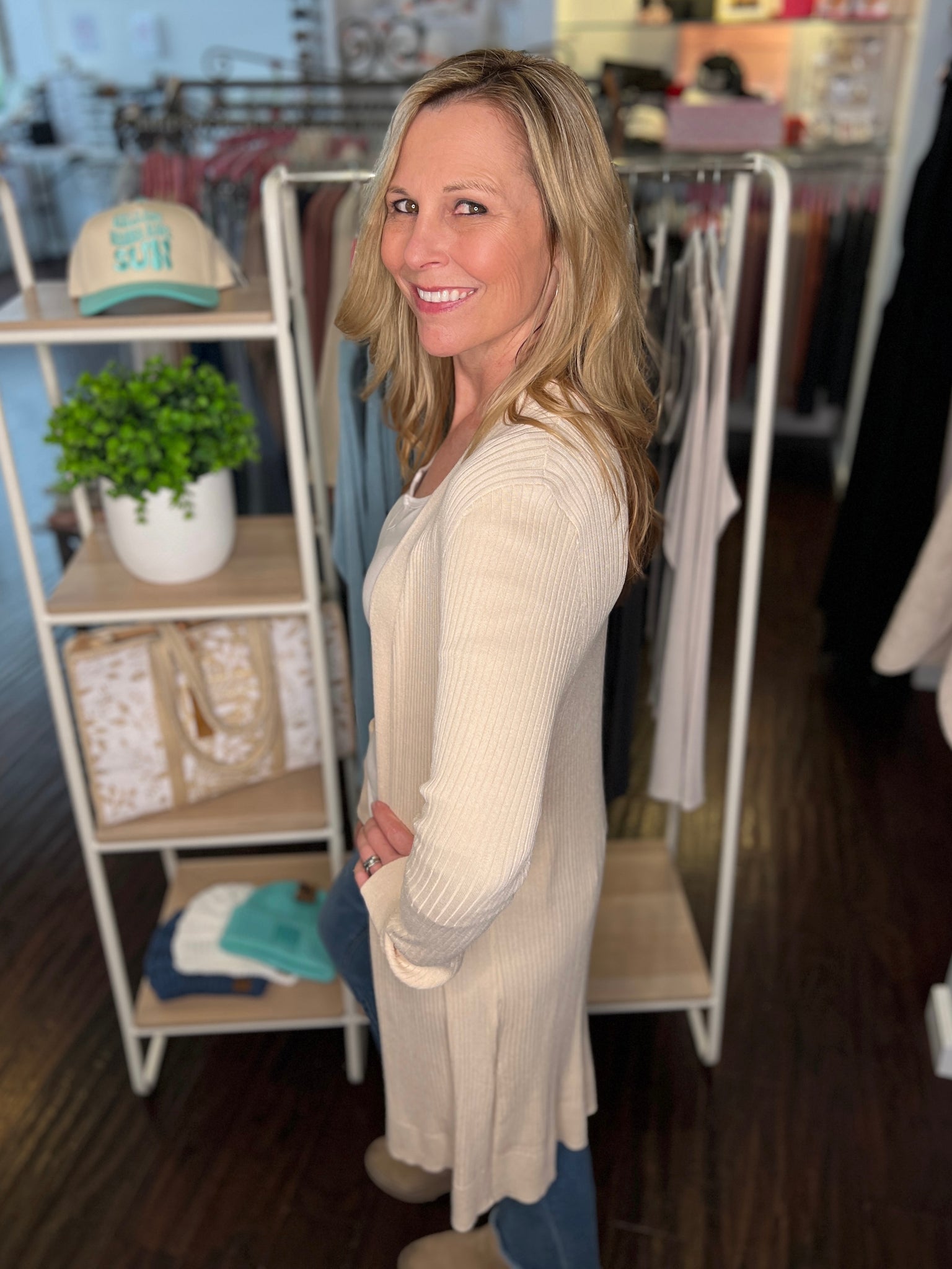Effortlessly stylish and versatile, our Ribbed Long Cardigan in cream is the perfect addition to any closet. Crafted with long sleeves and a ribbed knit, this cardigan is ideal for everyday wear. Stay comfortable and chic with this timeless piece.
