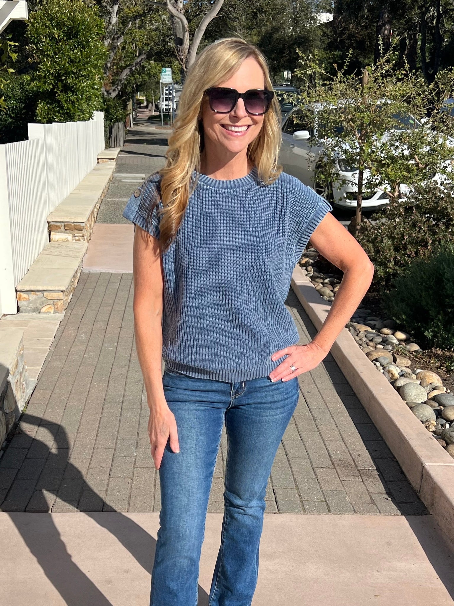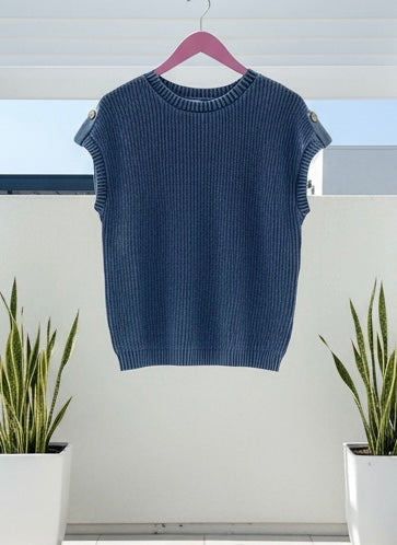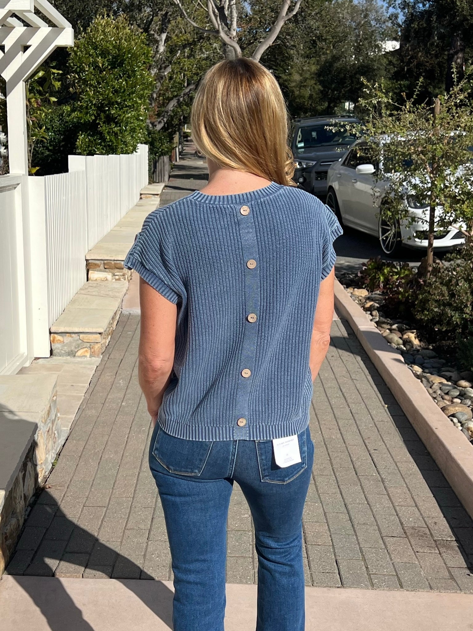 This short sleeved knit sweater features a chunky ribbed texture with a classic crew neckline. Designed with wood button-back detailing for a unique, elevated touch. The relaxed fit makes it perfect for layering over tees or wearing solo. Available in indigo and khaki.