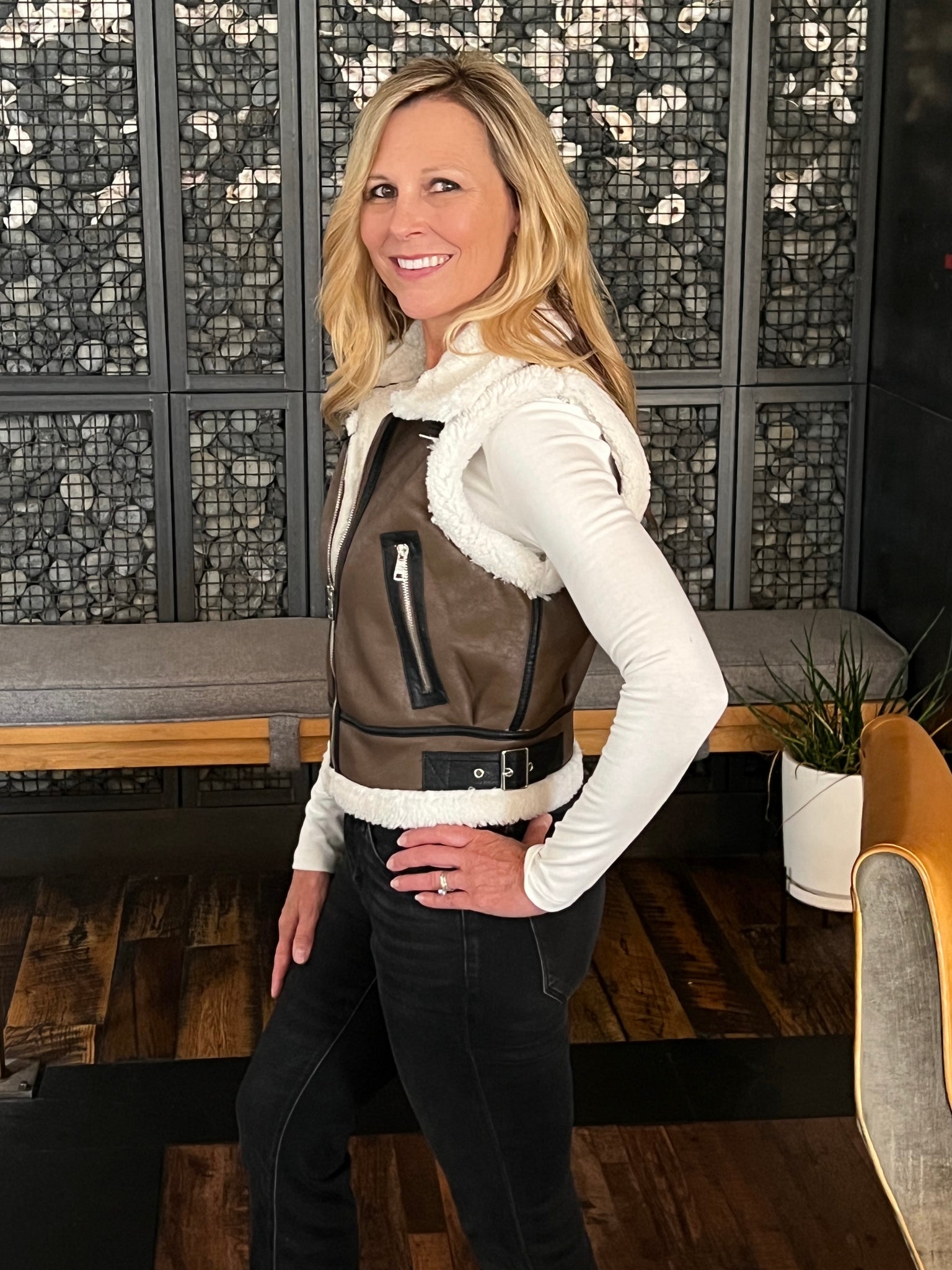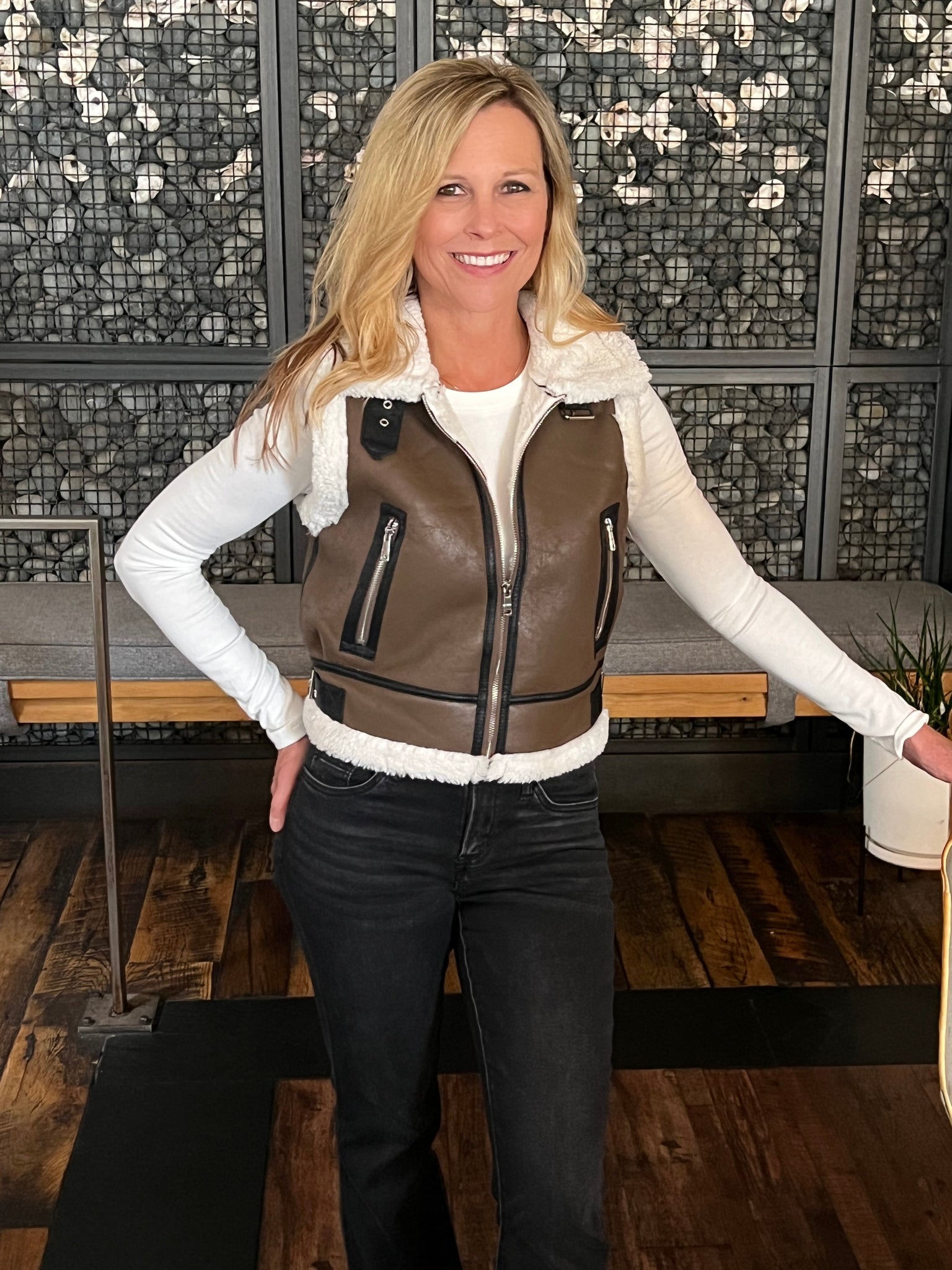 Stay cozy and stylish with the sheepish faux fur vest. This brown and white shearling vest features a zipper closure, two zippered pockets, and chic black accents. Perfect for adding a touch of warmth and texture to any outfit.