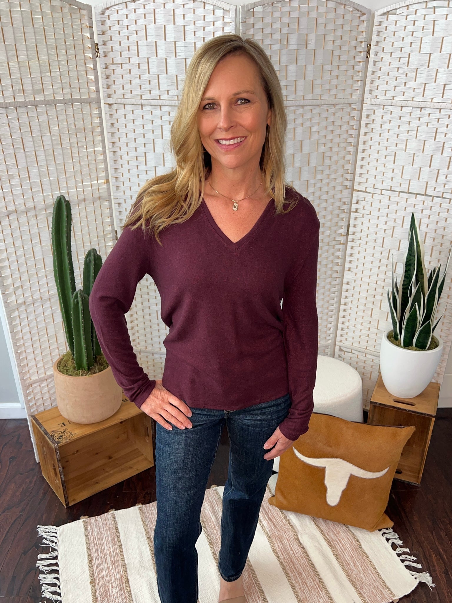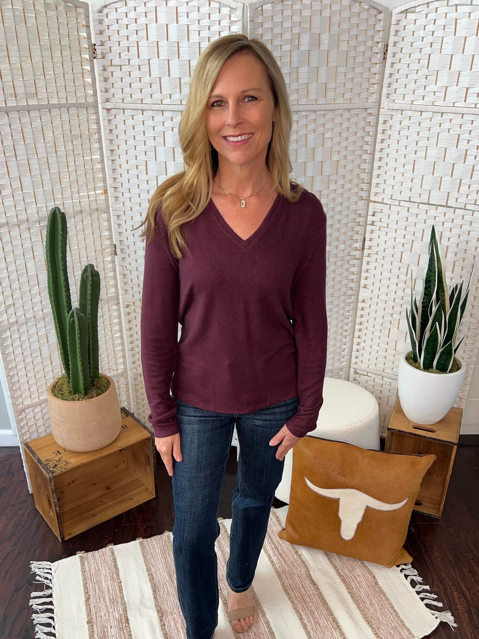 This maroon V-neck long sleeve top features subtle shirring for stylish, textured look. Soft and comfortable, it’s perfect for adding a pop of color to your casual or dressy outfits.