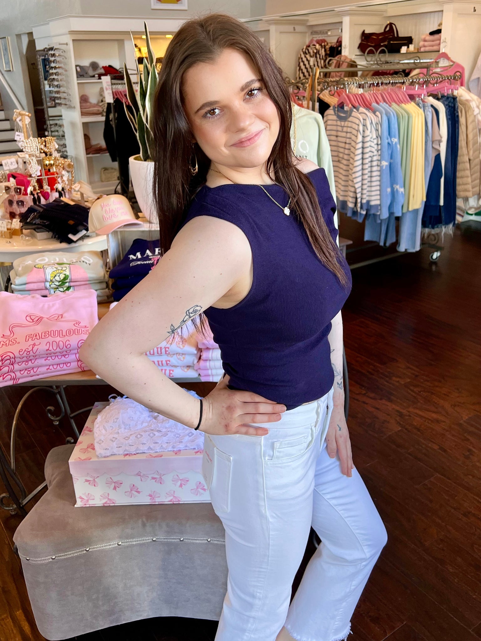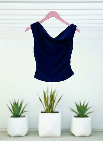 This rich navy top is high on style. It features an off the shoulder style on one side, a fitted body with side pleating and a cropped length. Great with all of your high waisted jeans or a cute skirt. Fabric is a sweater weight.