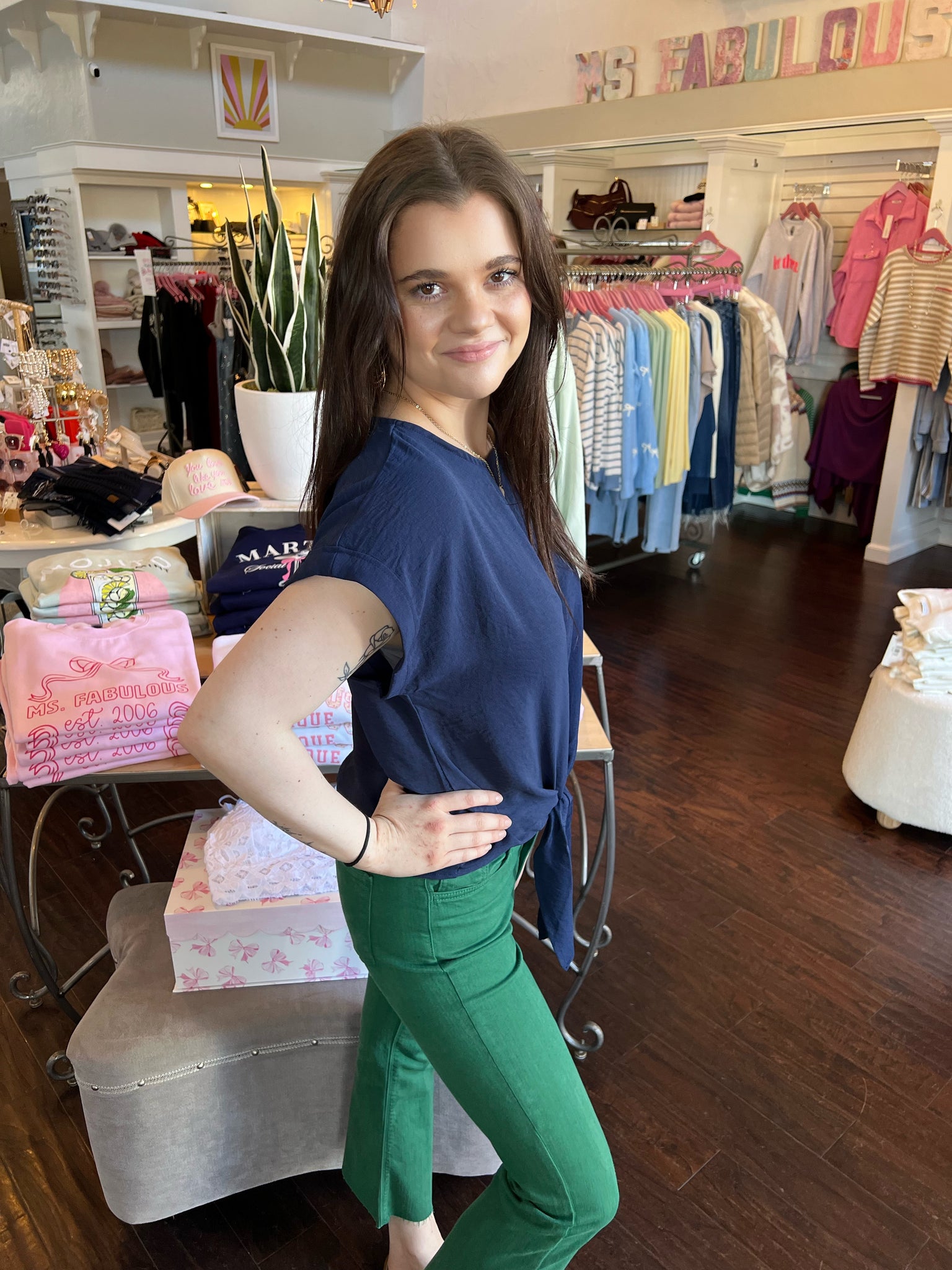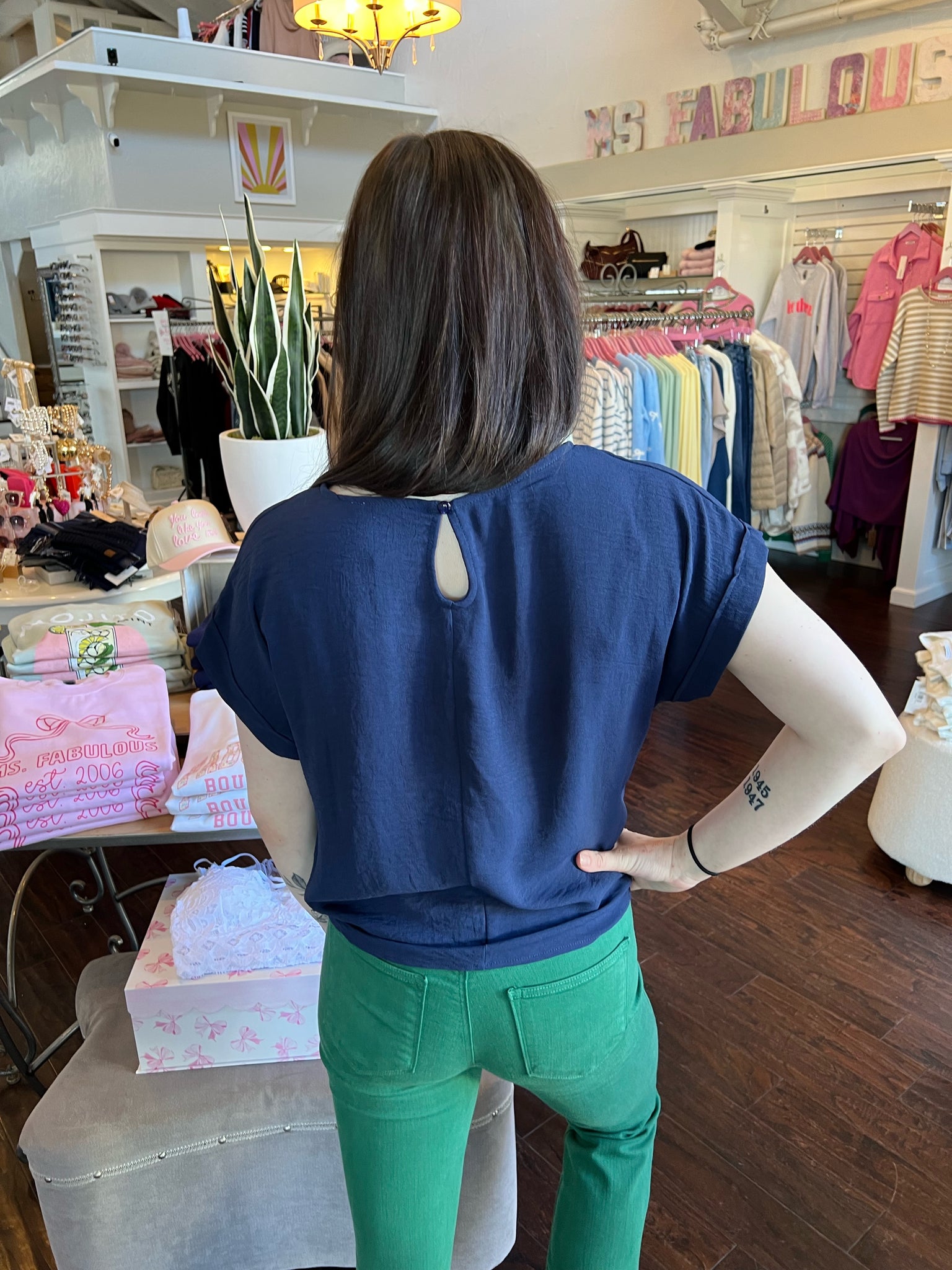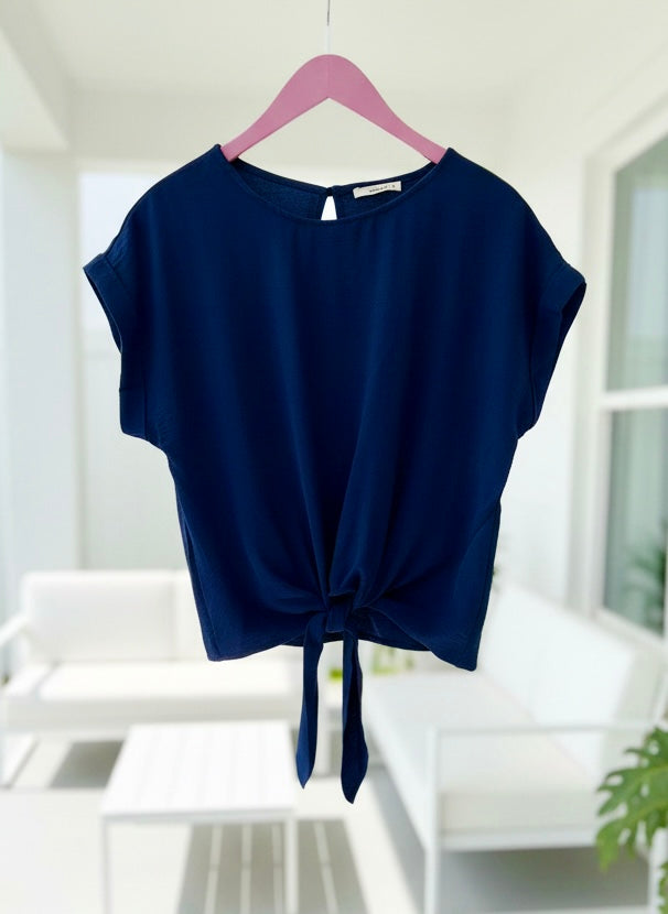 The perfect updated basic is here. The Avery features short sleeves with a crew neckline, back keyhole button closure and a tie front at the waist. Fit is slightly cropped and the fabric is lightly textured.