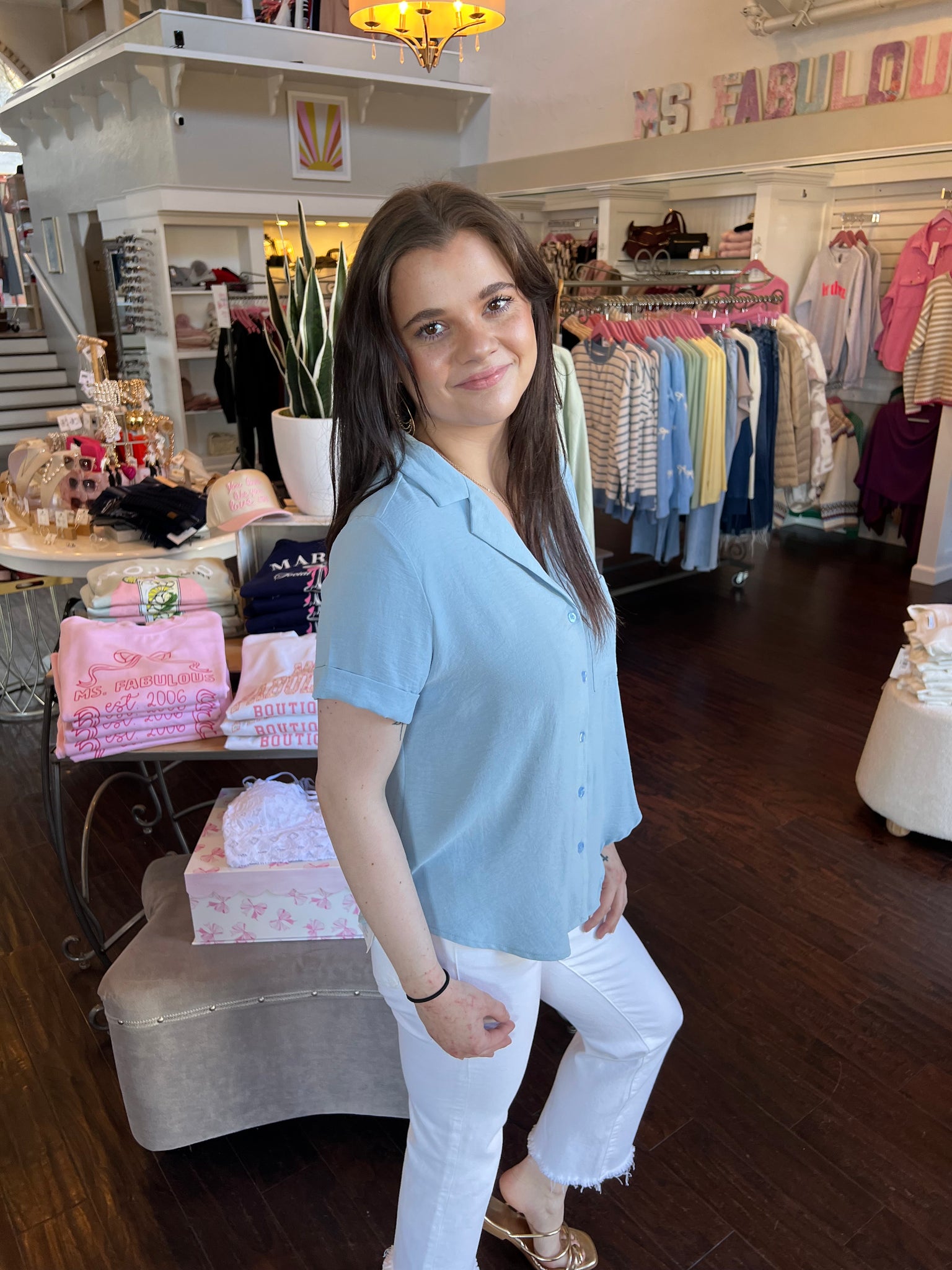 Sometimes the simple styles are the best and the Melissa is just that! Featuring a button front style with collar, short sleeves and simple styling. The fit is slightly cropped and the fabric is lightly textured.