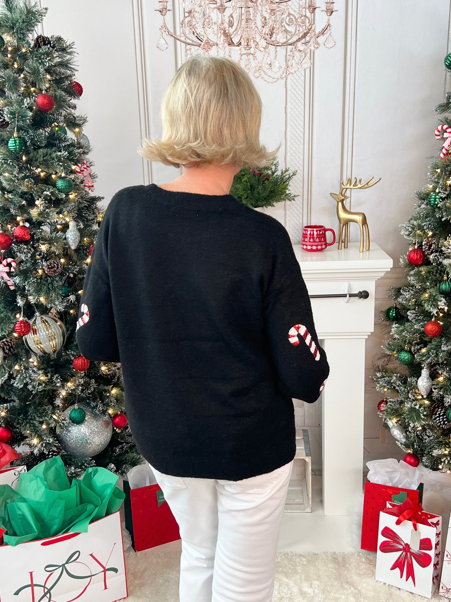 This Candy Cane Lane Sweater brings a playful holiday spirit to your wardrobe with its bold red and white candy cane patterns on a sleek black base. It’s designed to add a festive touch while keeping your look stylish and fun. Perfect for cozy gatherings or holiday outings, this sweater makes celebrating the season easy and chic!