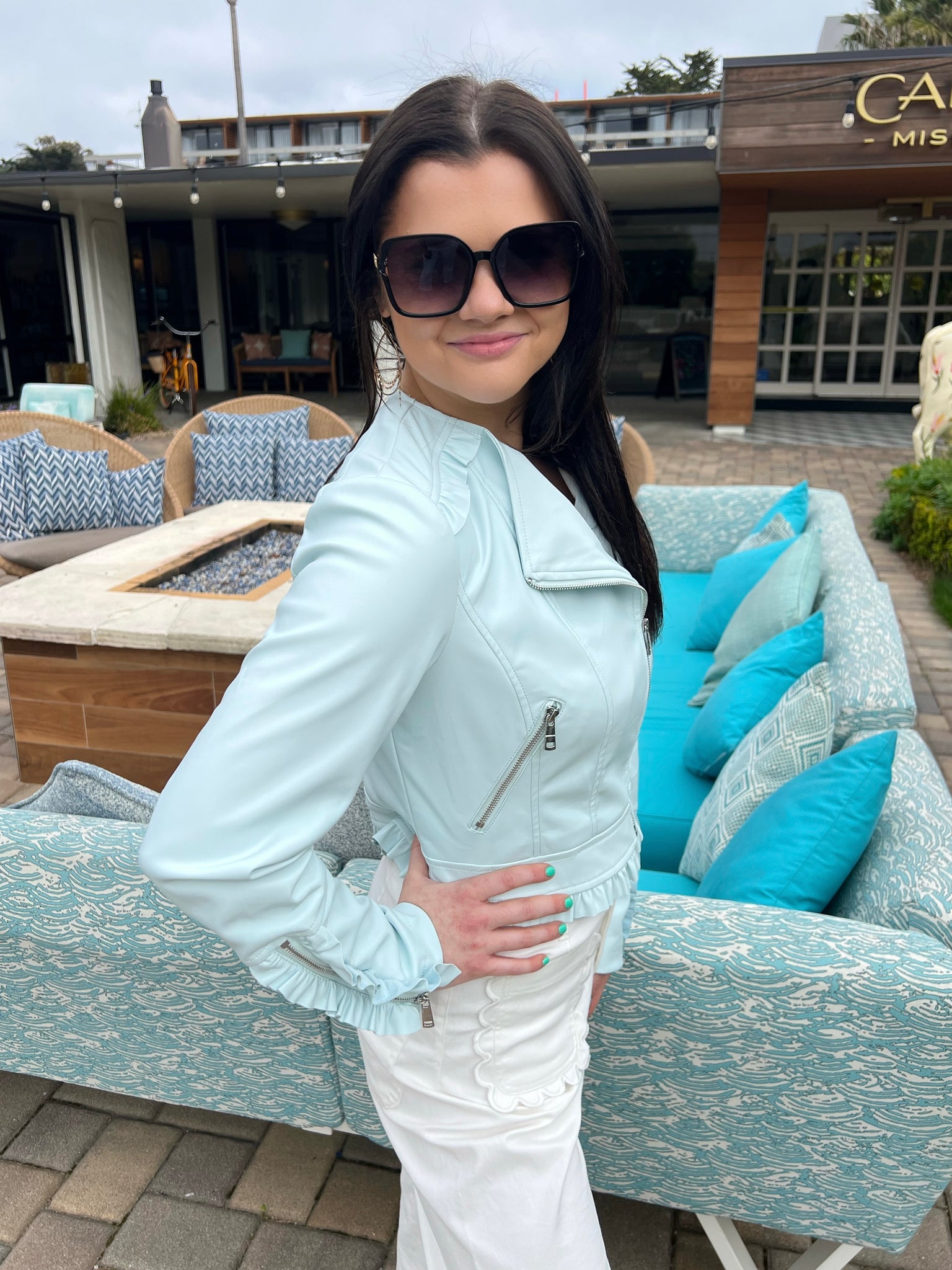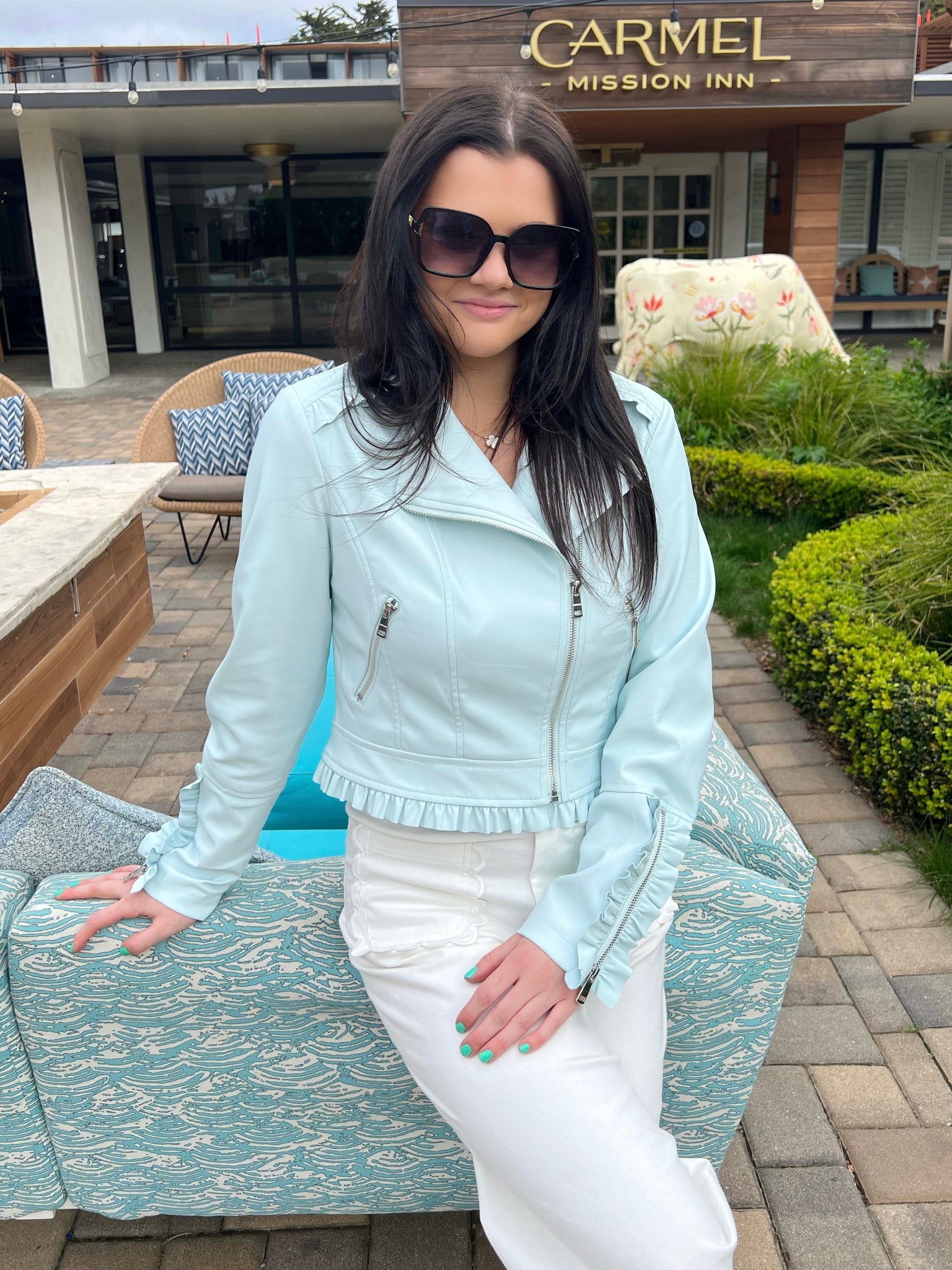 A soft blue faux leather jacket featuring feminine ruffle accents along the shoulders and hem. The zip-front closure and zip pockets add a modern touch, making it a standout layering piece.