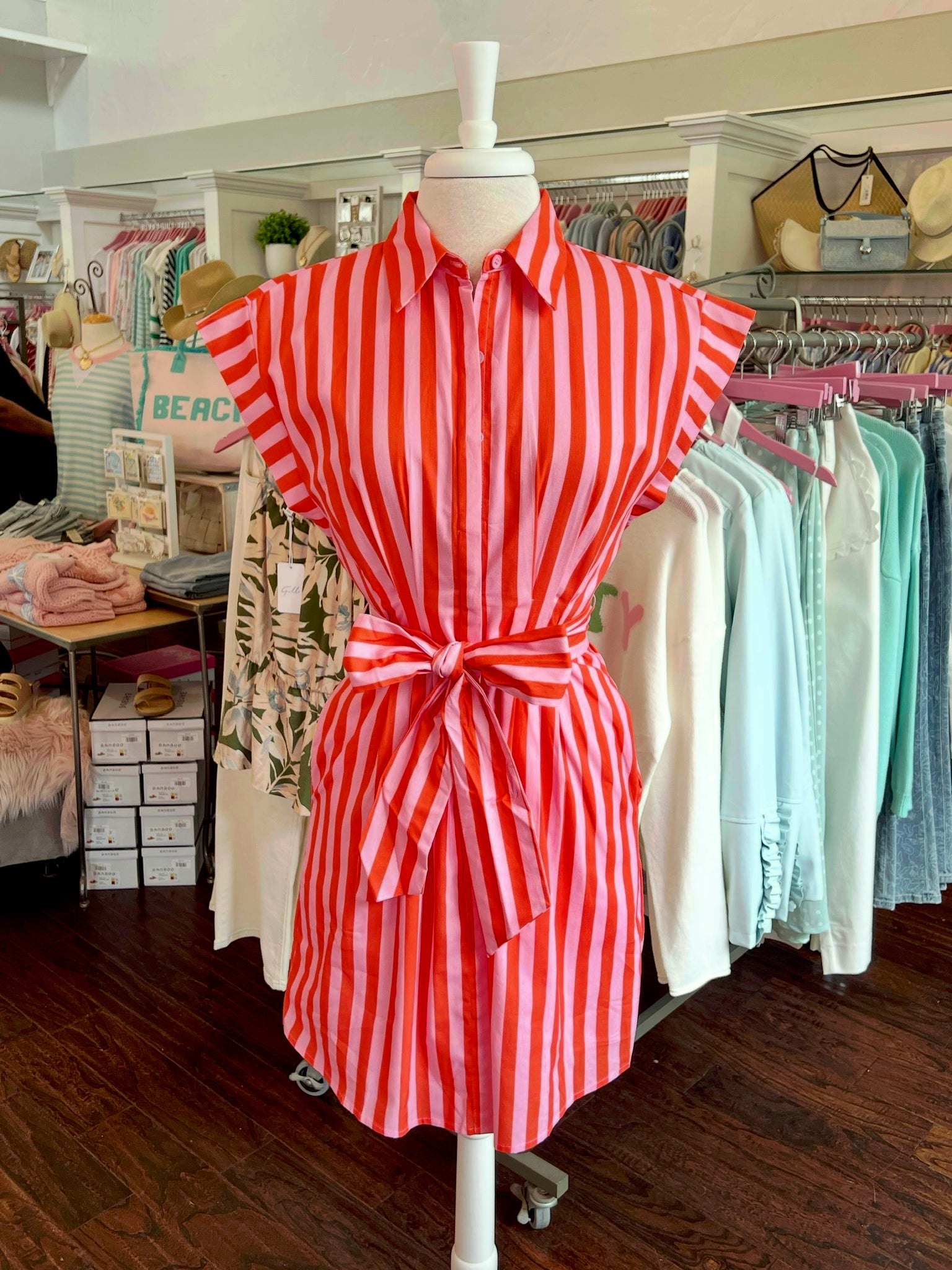 A mini striped dress with a flattering button-down front and adjustable tie waist for the perfect fit. Lightweight and effortless, it’s perfect for brunch, beach days, vacations, or just an easy everyday outfit.