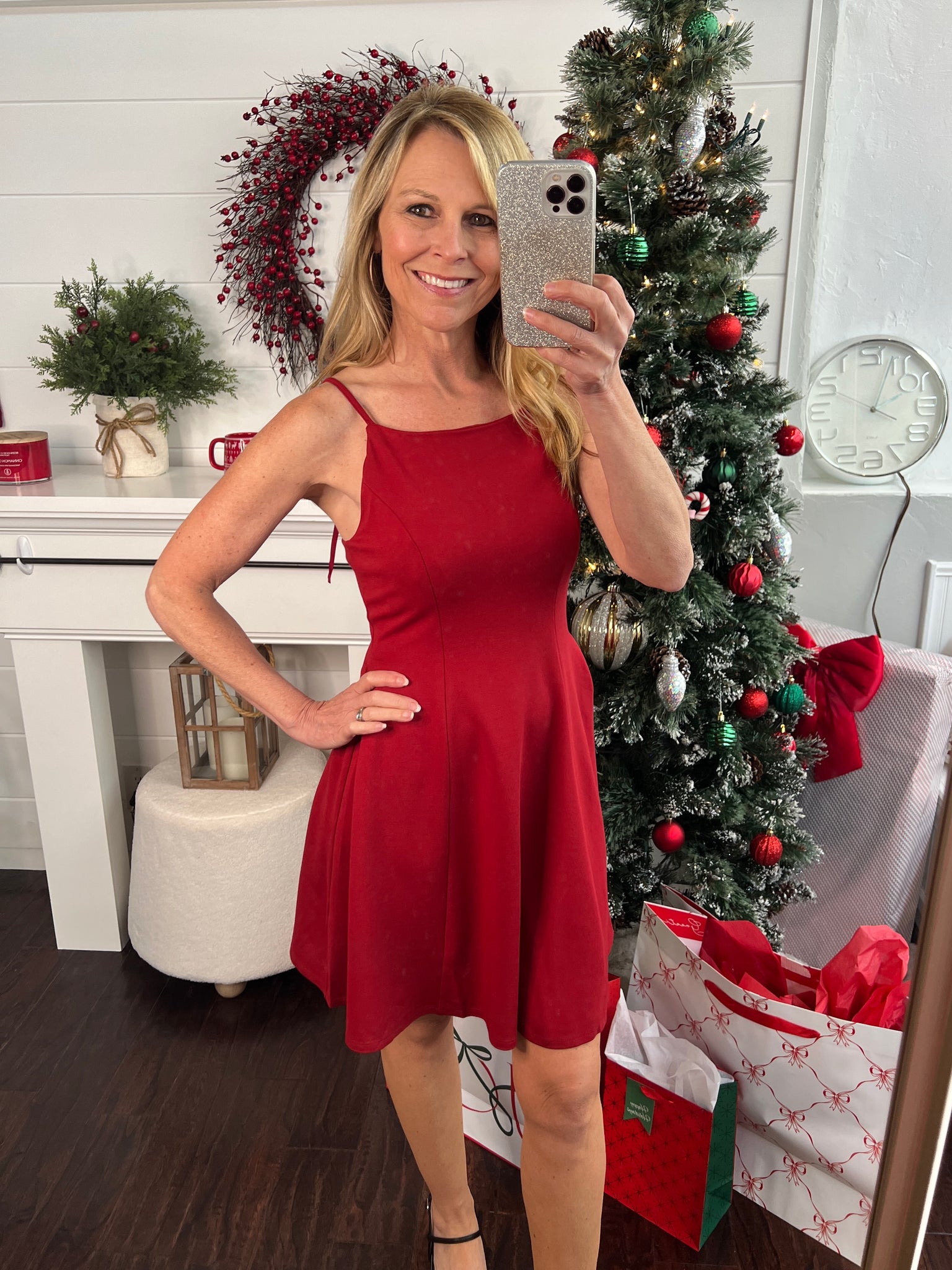 This romantic darling is ready for love! Featuring a skater style fit with thin adjustable straps and bow details, a zipper back closure and fitted waist. Dress runs small.