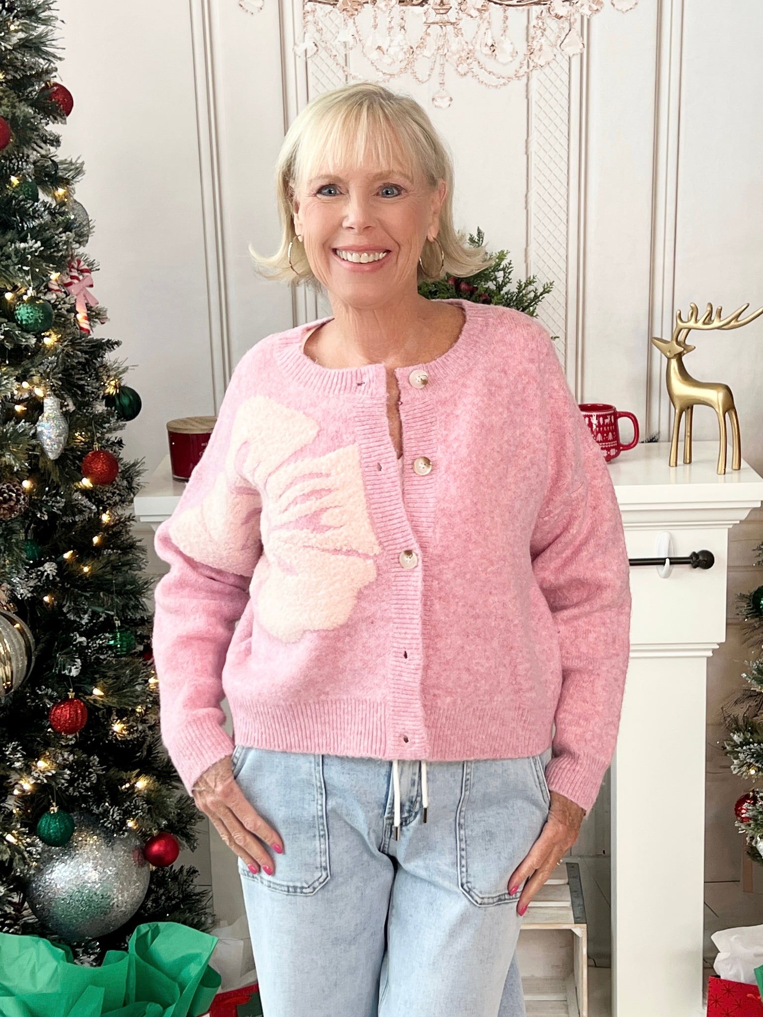 The Wildflower Cardigan is a charming light pink knit perfect for adding a soft, feminine touch to any outfit. Featuring a large, textured flowered design on the front and delicate round buttons, it’s cozy and stylish with a simple crew neck collar. A lovely piece that feels like a warm hug!