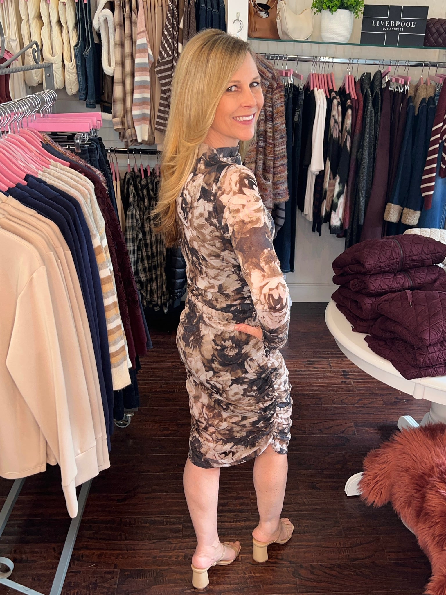 Fancy this! Get ready for the fall and winter season with this pretty floral midi dress. The mesh fabric has nice stretch and features long sleeves, side rouching and a midi length. Dress has a ‘mini’ lining and fits true to size.