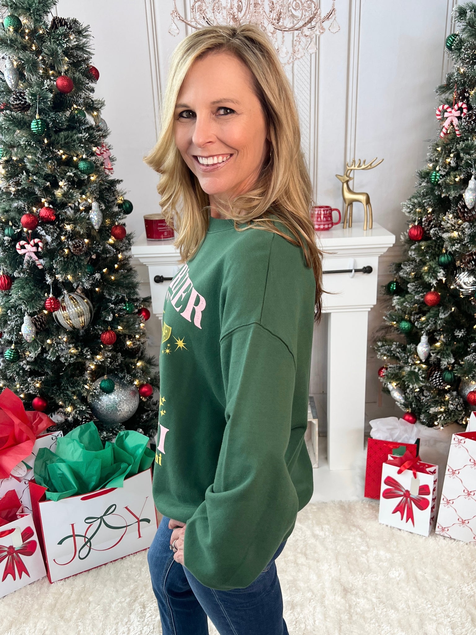 Get ready to sleigh the season with the Merrier With A Martini Sweatshirt! This cozy green fave is packed with festive vibes, featuring bright pink and yellow lettering, cheeky martini glasses, and sparkling stars that shout holiday fun. It’s super soft and relaxed, making it your go-to for sipping, celebrating, or just chilling in style!