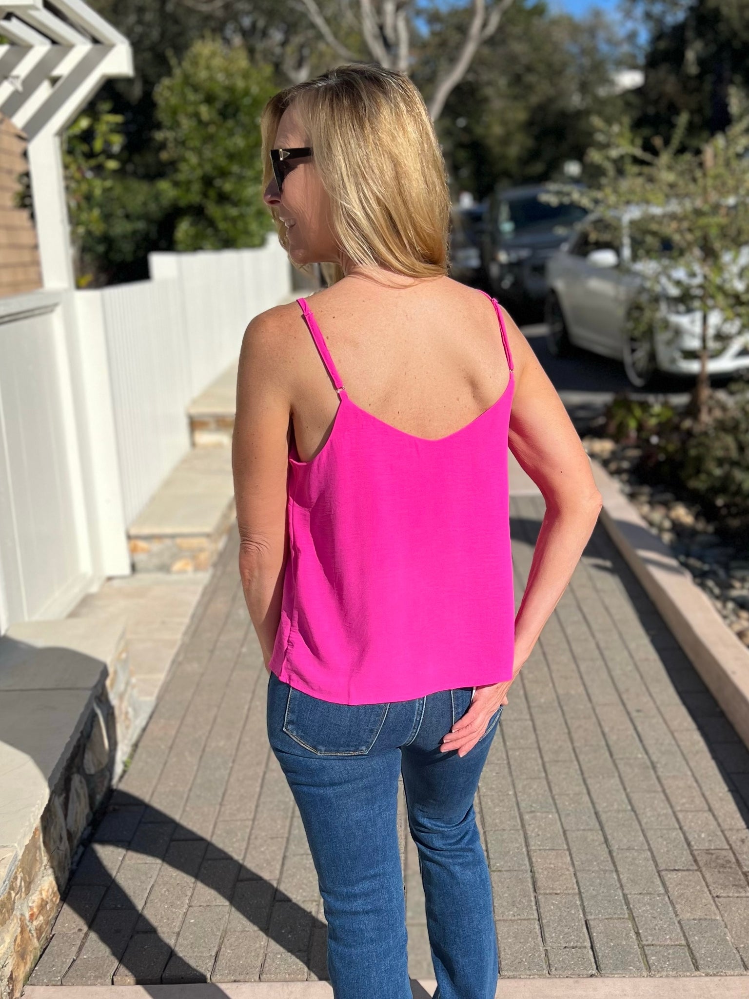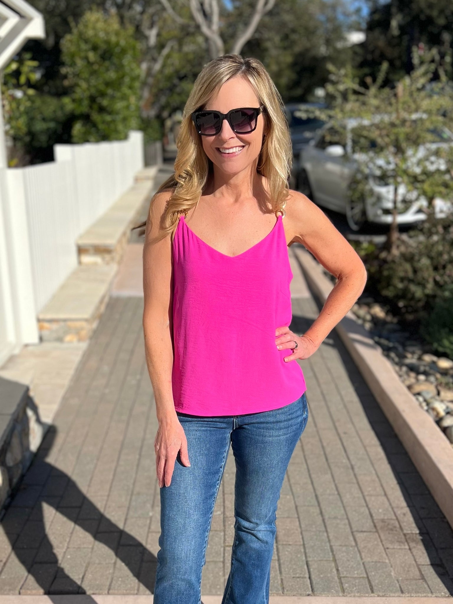 Make this your travel companion wherever you go. The Jessica tank is the perfect little partner for a dressy pant, skirt or pair of shorts with its gold trim hardware with adjustable straps and v-neckline. Fit is slightly cropped and the fabric is lightly textured.