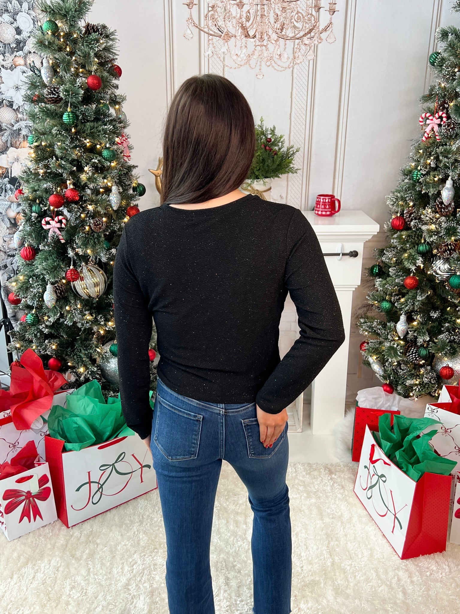 Ass a little sparkle to the season with this twist front top. Featuring a crew neckline with stretch fabric and sparkle detail. The fit is slightly cropped.