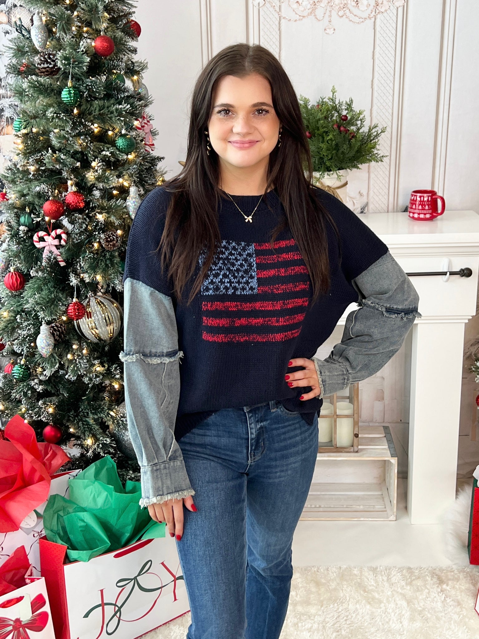 This Americana Denim Sleeve Sweater combines classic patriotism with modern edge, featuring a bold American flag graphic on a rich navy knit base. The unique denim sleeves add texture and a cool, casual vibe that makes this piece stand out. Perfect for layering or wearing solo, it’s a statement sweater that blends comfort with unmistakable style!