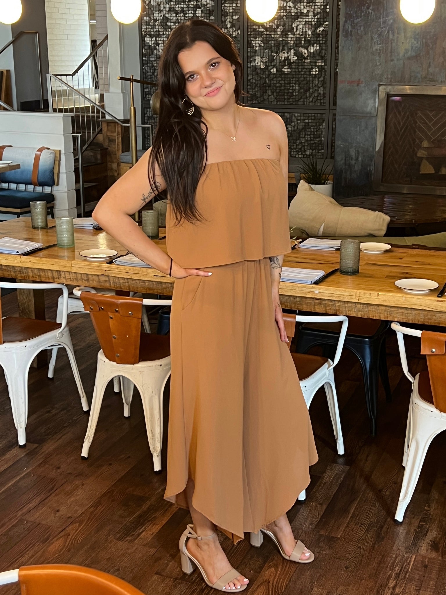 This jumpsuit features a draped, sleeveless design with wide-leg pants for a modern, elegant look. Available in classic camel, sleek black, and bold animal print, the comfortable and flattering silhouette makes a it perfect for both casual and dressy occasions.